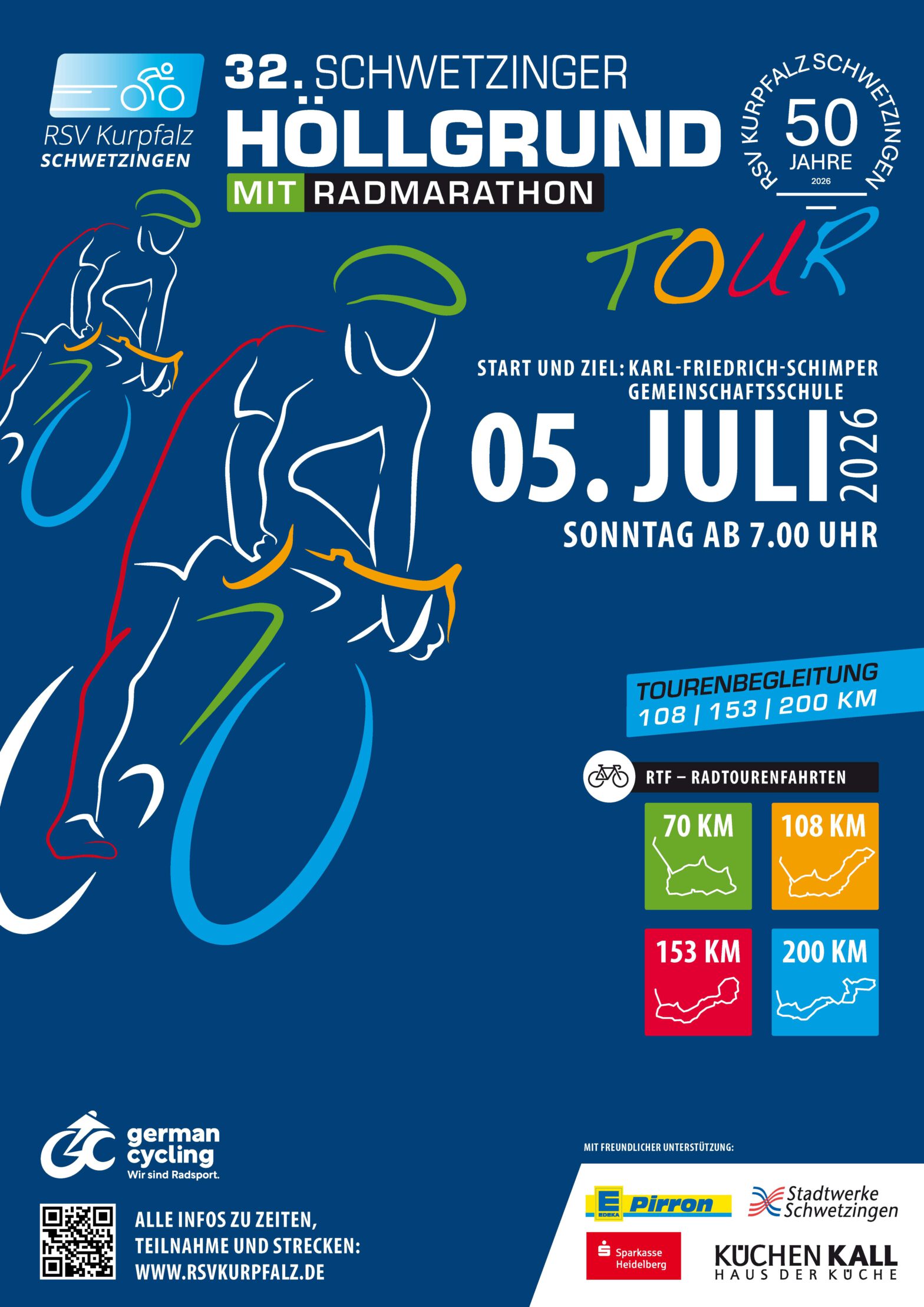 Bei idealem Radsportwetter – trocken und nicht zu heiß – nahmen am vergangenen Sonntag erneut rund 300 Teilnehmerinnen und Teilnehmer die verschiedenen Strecken der traditionellen „Schwetzinger Höllgrund-Tour“ in Angriff. Wie bereits im Vorjahr standen vier landschaftlich reizvolle Routen mit Distanzen von 67, 103, 150 und 200 Kilometern zur Auswahl. Die Strecken führten auf verkehrsarmen Straßen…